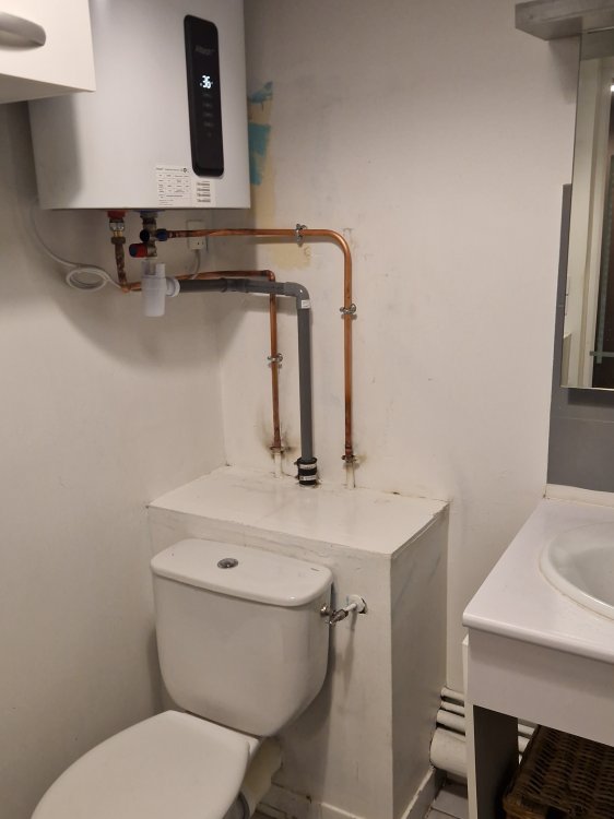 Constat d’un chauffe-eau électrique dangereusement installé sur cloison en plaques de plâtre, avec fixation non conforme et risque avéré de chute. Dépose complète de l’équipement existant. Fourniture et installation d’un chauffe-eau électrique plat, fixé sur un mur porteur en béton armé, conformément aux règles de sécurité et aux contraintes de charge.